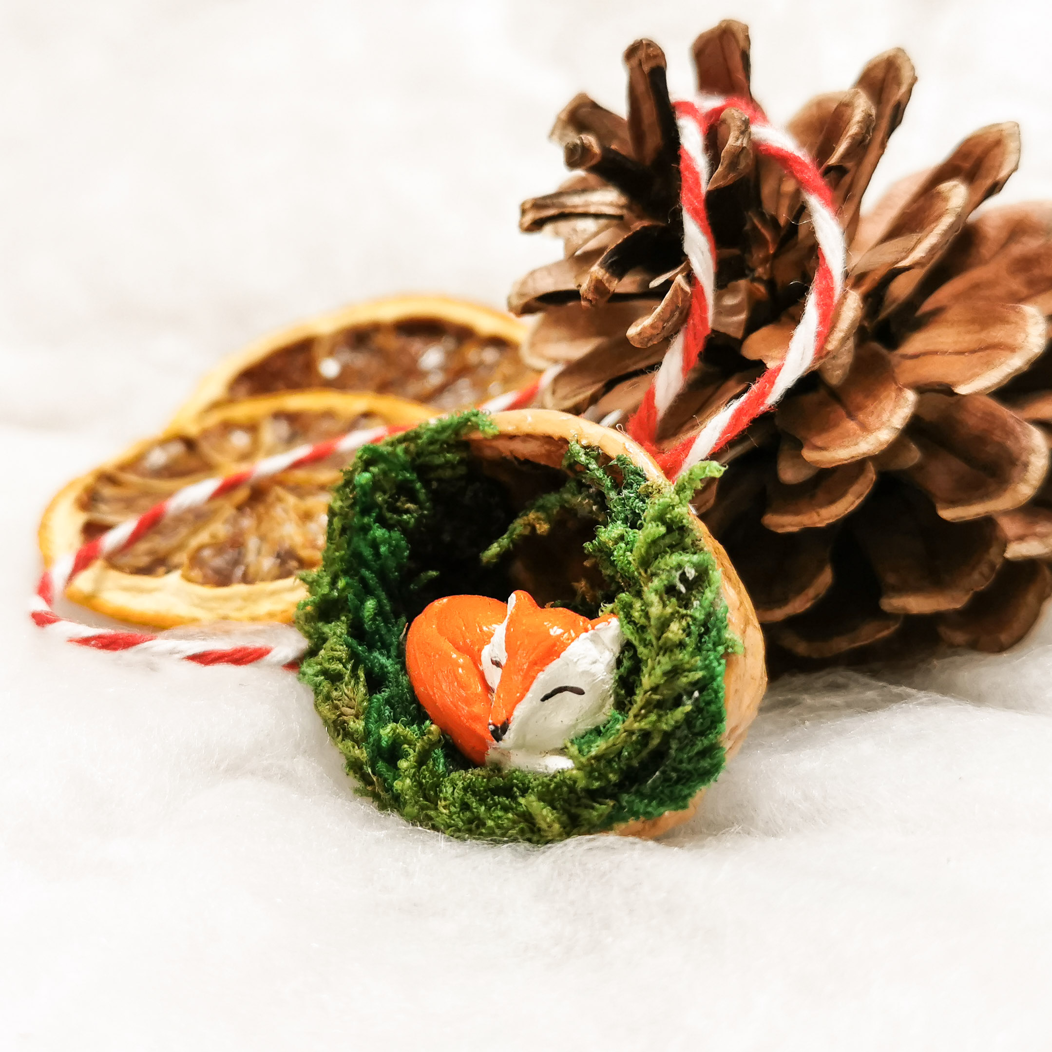 The nutshells are real, cleaned and varnished, the moss is artificial and these foxes were made by me with air-dry clay. I also make bunnies and hamsters, and this year I’ll attempt owls I think!
