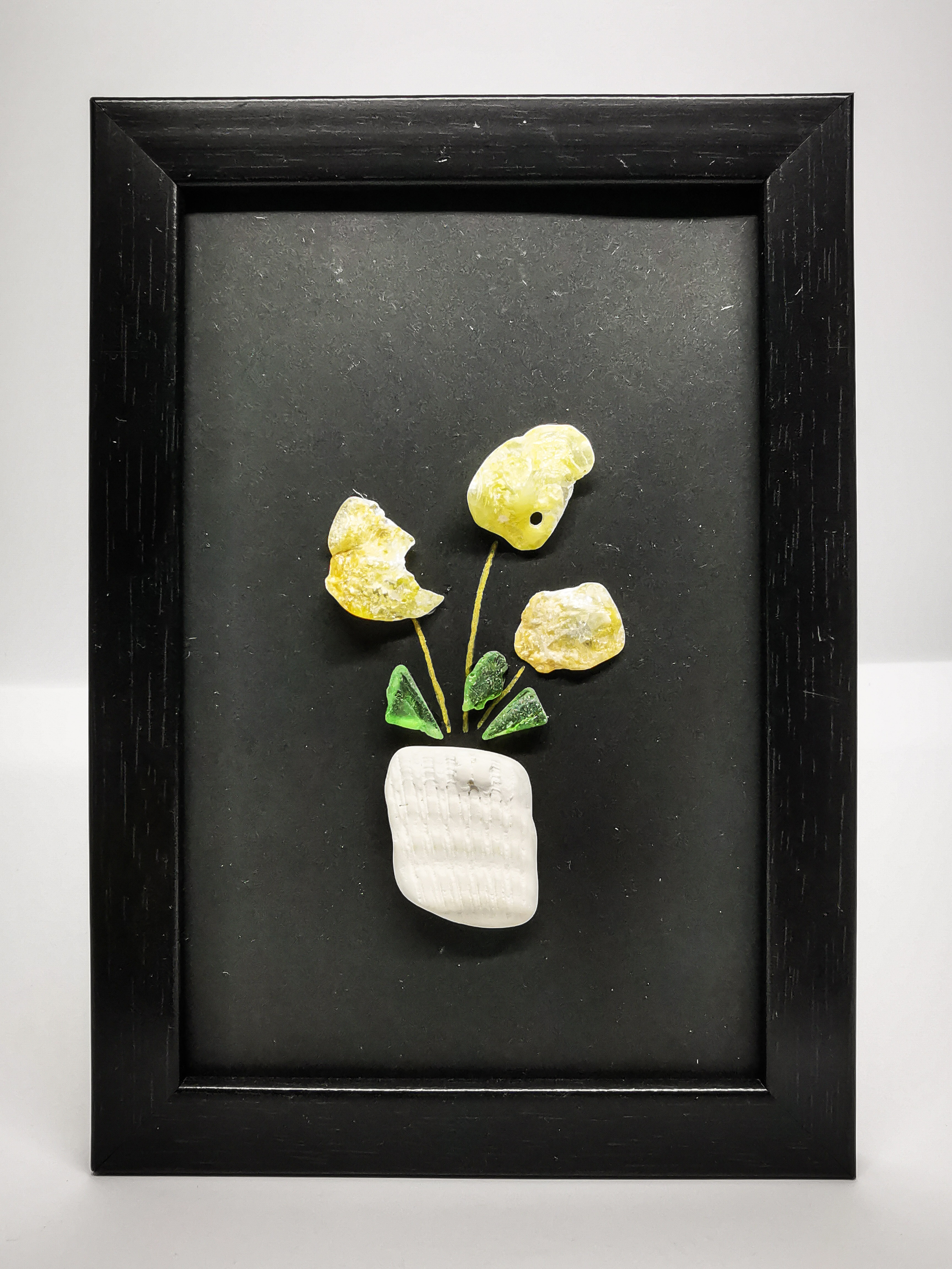 Spanish sea glass and shells on black paper, framed.